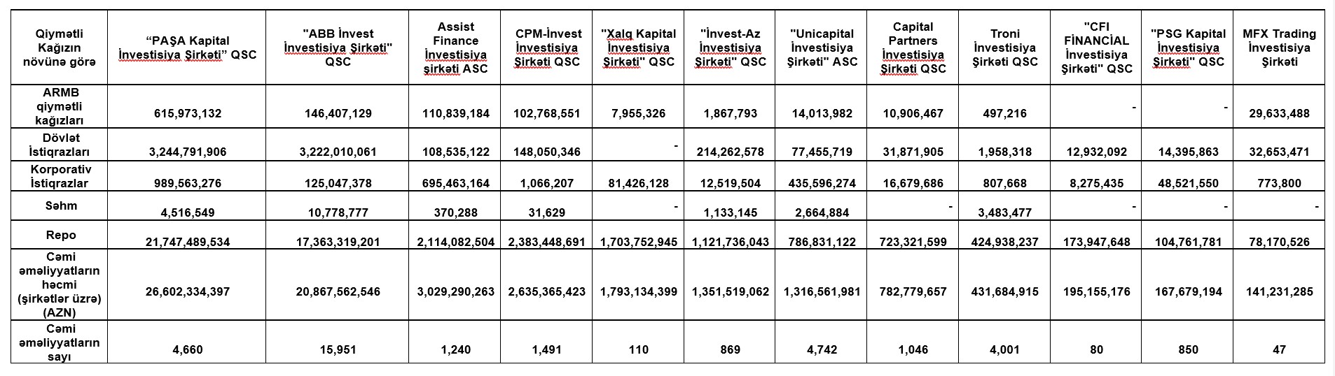 Marja.az Birjaya istinadən xəbər verir ki, 26 milyard 602 milyon 334 min manat əməliyyat həcmilə “PAŞA Kapital İnvestisiya Şirkəti” QSC 1-ci, 20 milyard 867 milyon 562 min manat əməliyyat həcmi ilə "ABB İnvest İnvestisiya Şirkəti" 2-ci, 3 milyard 29 milyon 290 min manat əməliyyat həcmi ilə "Assist Finance İnvestisiya Şirkəti" ASC 3-cü yeri tutub.