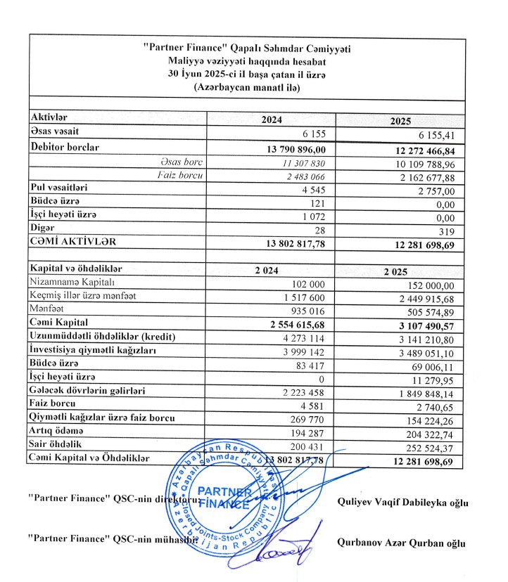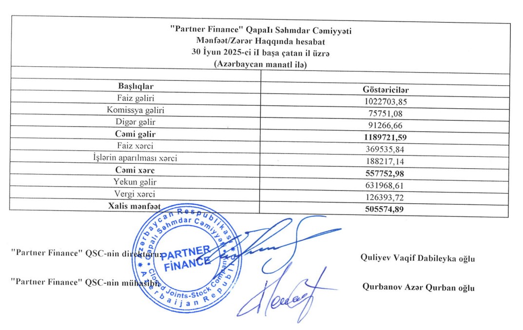 2025-ci ilin ilk 6 ayında "Partner Finance" faiz gəlirləri 1 milyon manatdan çox - 1 milyon 23 min manat təşkil edib.