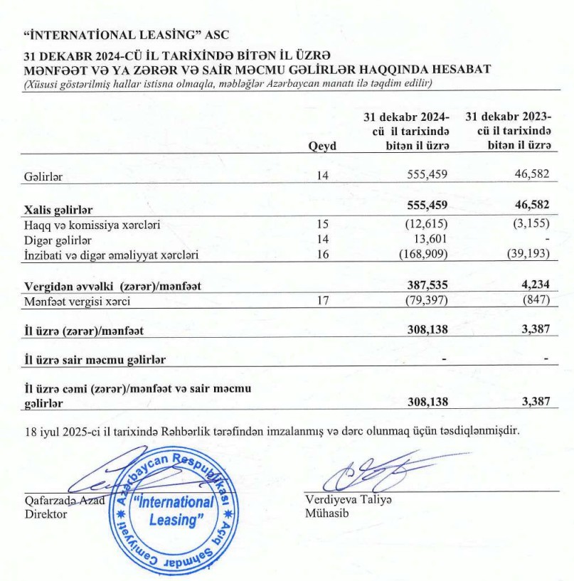 Avtomobil lizinqi məhsulları təklif edən "İnternational Leasing" ASC 2024-cü ili 308 min 138 manat xalis mənfəət ilə başa vurub. Şirkət 2023-cü ili 3 min 387 manat xalis mənfəət ilə bağlamışdı. Beləliklə, ötən il "İnternational Leasing"in xalis mənfəəti 91 dəfə və ya 304 min 751 manat artıb.