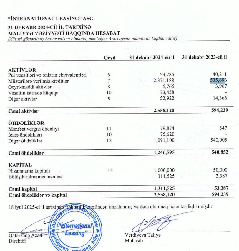 Ötən il "İnternational Leasing"in lizinq portfeli (müştərilərə verilmiş kreditlər) 4,4 dəfə artaraq 31 dekabr 2024-cü il tarixində 2 milyon 371 min manata çatıb. Şirkət 2023-cü ilin sonunda 536 min manat cəmi portfelə malik idi.