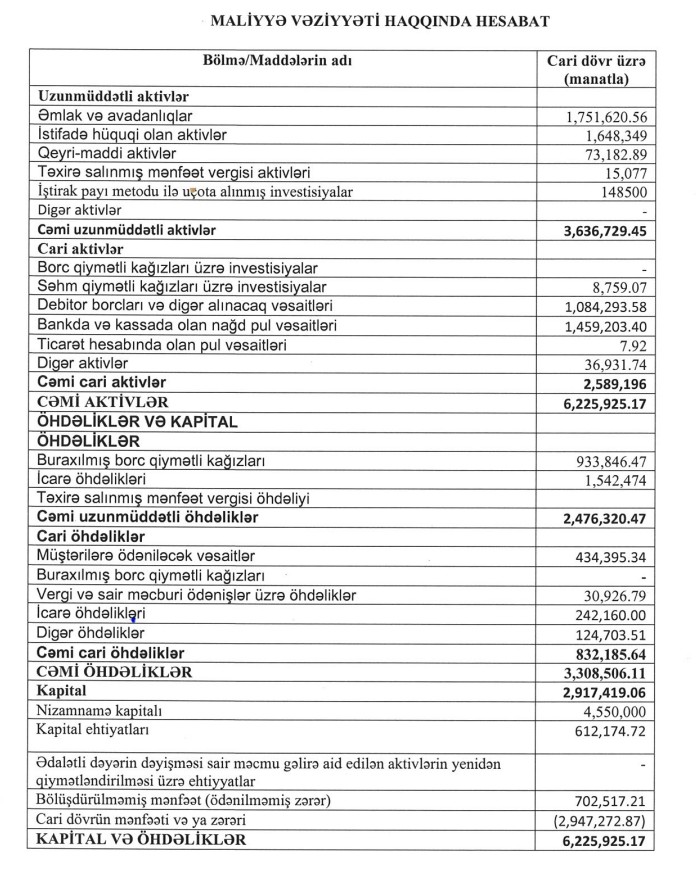Azərbaycanın investisiya şirkətində 6 ay ərzində 3 milyon manata yaxın xalis zərər