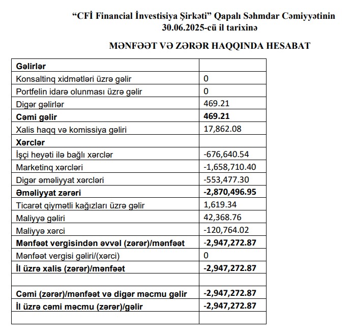 “CFI Financial İnvestisiya Şirkəti” 2025-ci ilin 1-ci yarısını (yanvar-iyun) 2 milyon 947 min manat xalis zərər ilə başa vurub. "CFI Azerbaijan" 2025-ci ilin Fevral ayında rəsmi açılışını qeyd edib. Səhmdar dəyişikliyindən sonra Şirkət bazara daxil olur və yaranmış zərər böyük ehtimalla bununla bağlı ola bilər.