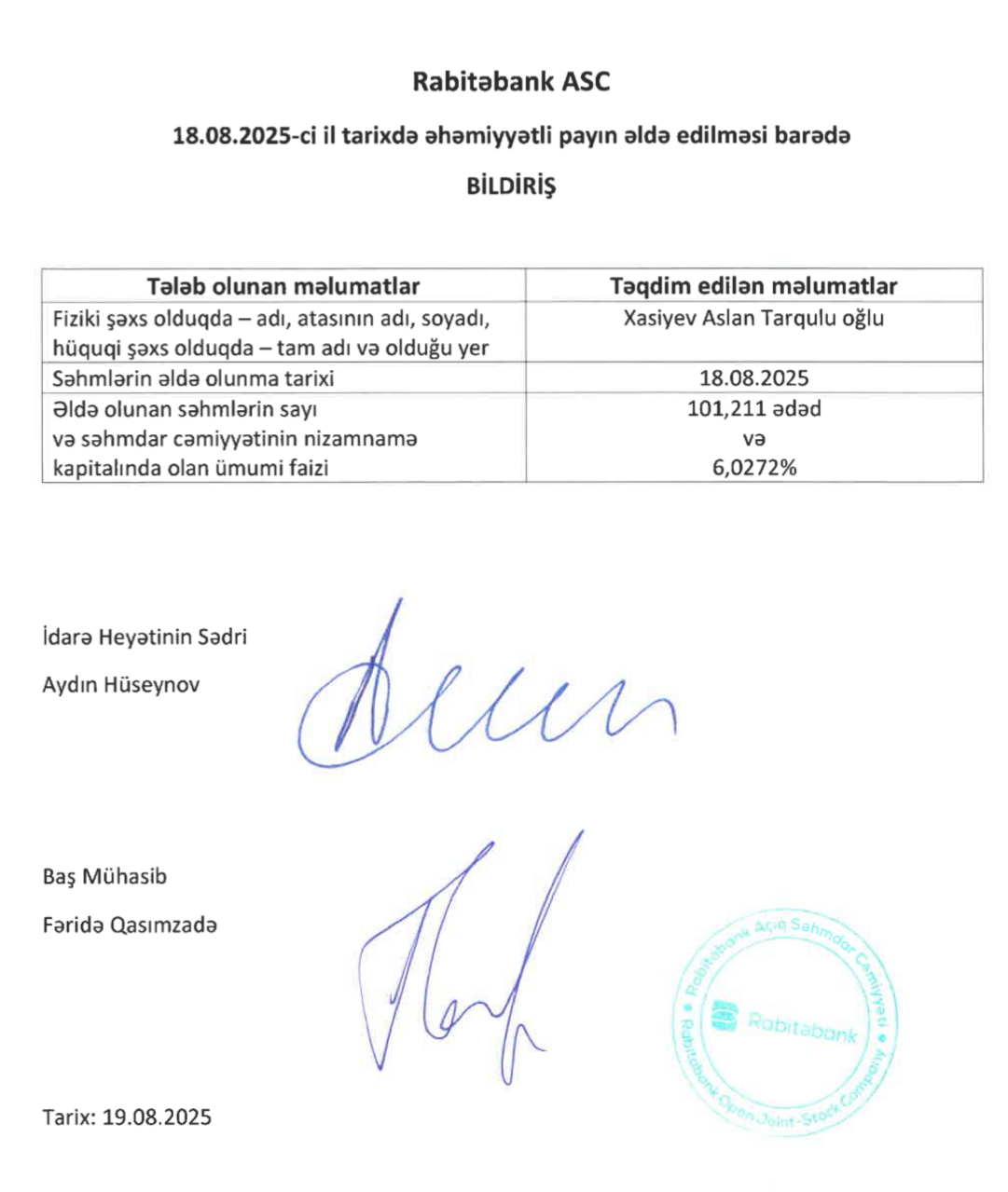 "Rabitəbank" ASC əhəmiyyətli payın əldə edilməsi və özgəninkiləşdirilməsinə dair məlumat yayıb.