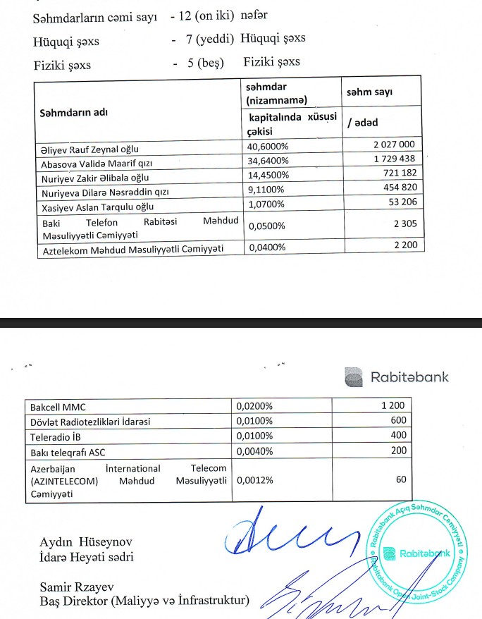 31 dekabr 2024-cü il tarixində 102 milyon 47 min manat nizamnamə kapitalına malik olmuş “Rabitəbank” ASC-nin səhmdarları Rauf Əliyev (40.60%), Validə Abasova (34.64%), Zakir Nuriyev (14.44%), Dilarə Nuriyeva (9.11%), Aslan Xasiyev (1.07%) və digərləri (0.14%) olub.