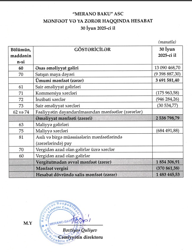 Qida məhsullarının topdan satışı fəaliyyətilə məşğul olan "Merano-Baku" ASC 2025-ci ilin 1-ci yarısını (yanvar-iyun) 1 milyon 483 min manat xalis mənfəət ilə başa vurub. Xatırladaq ki, "Merano-Baku" ASC 2024-cü ili 1 milyon 939 min manat xalis mənfəət ilə bağlamışdı.