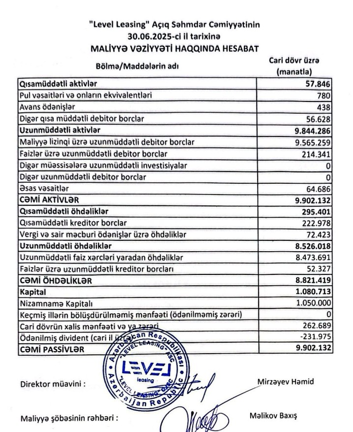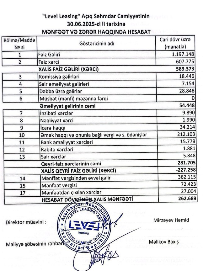 "Level Leasing" ASC 2025-ci ilin 1-ci yarısını (yanvar-iyun) 263 min manat xalis mənfəət ilə başa vurub. Şirkət 2024-cü ili 387 min manat xalis mənfəət ilə bağlamışdı.