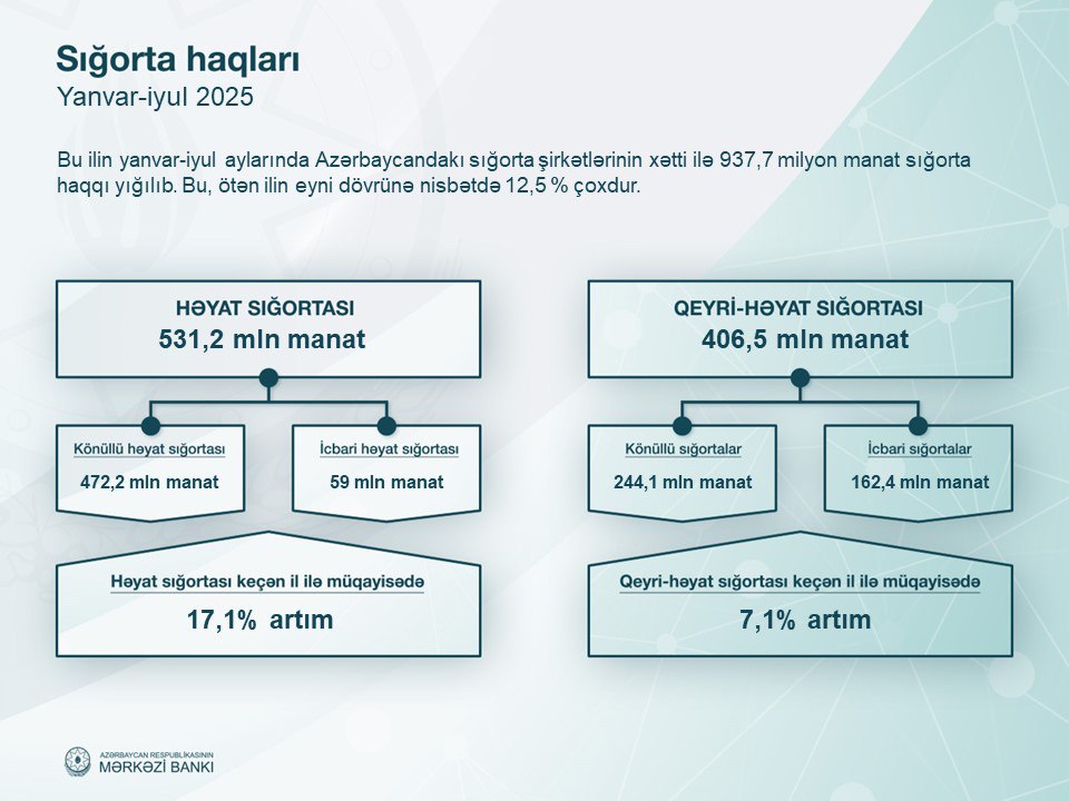 Azərbaycan Mərkəzi Bankı sığorta sektorunun 2025-ci ilin yanvar-iyul aylarına dair statistikasını açqılayıb.