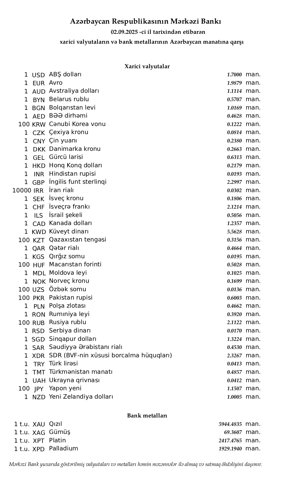 Rəsmi məzənnələr açıqlandı