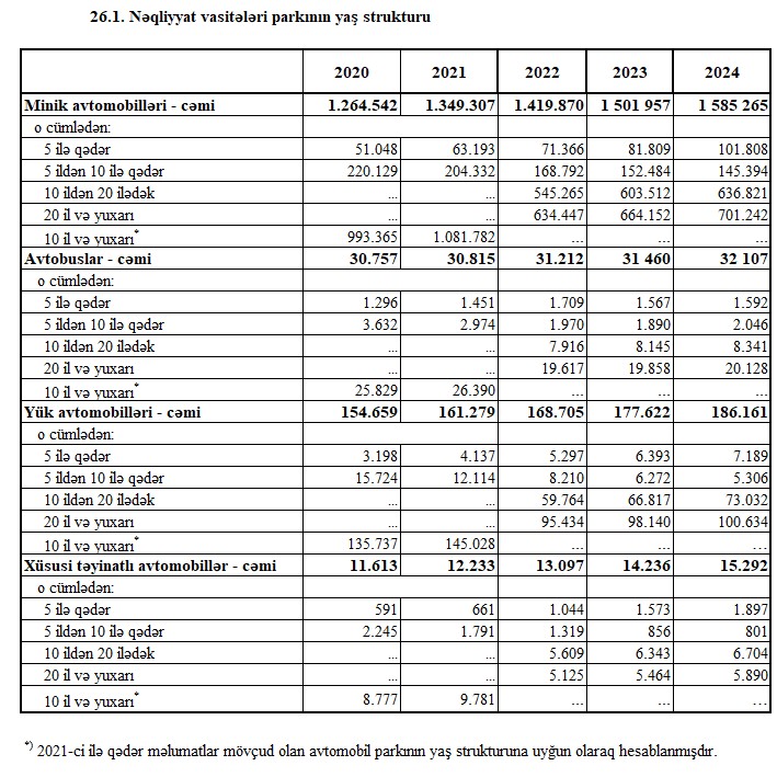 Marja.az-ın Dövlət Statistika Komitəsinin məlumatları əsasında apardığı hesablamalara görə, Azərbaycanın minik avtomobilləri parkının 84,4%-nin və ya 1 milyon 338 min 63 ədədinin yaşı 10 il və daha yüksəkdir. O cümlədən, minik avtomobillərinin 636 min 821 ədədinin və ya 40,2%-nin yaşı 10 ildən 20 ilədək, 701 min 242 ədədinin və ya 44,2%-nin yaşı isə 20 il və daha yuxarıdır.