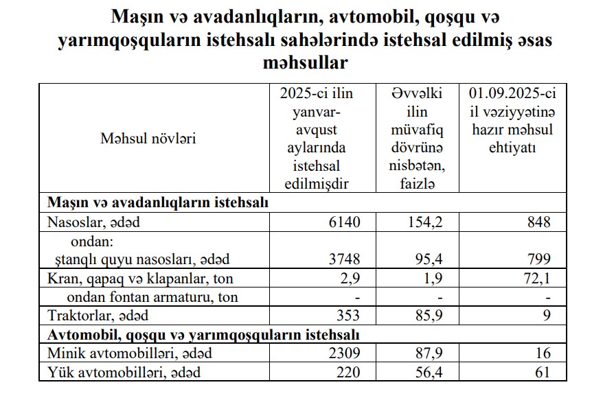 Cari ilin 8 ayı ərzində traktorların istehsalı 14,1 % azalaraq 353 ədəd, yük avtomobillərini istehsalı isə 43,6% azalaraq 220 ədəd təşkil edib.