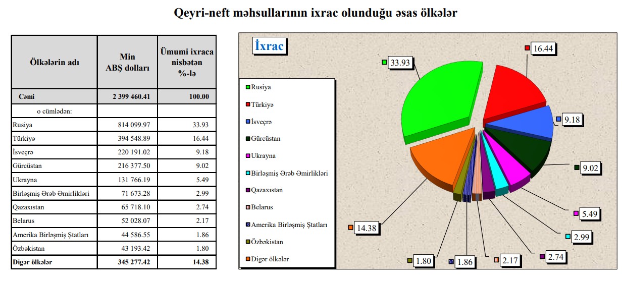 2024-cü ilin 8 ayında Azərbaycanın 2 milyard 179 milyon 882 min dollarlıq qeyri-neft məhsulları ixracının 752 milyon 15 min dolları və ya 34,50%-i Rusiyaya ixrac olunmuşdu.