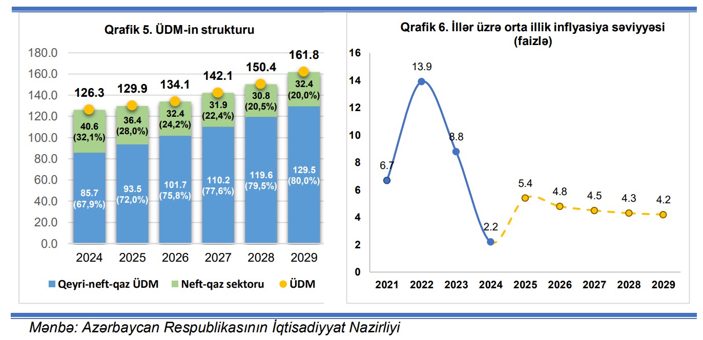 2029-cu ildə isə ÜDM-in 161,8 milyard manata (cari məzənnə ilə 95,2 milyard ABŞ dolları), qeyri-neft-qaz ÜDM-in isə 129,5 milyard manata çatacağı proqnozlaşdırılır.