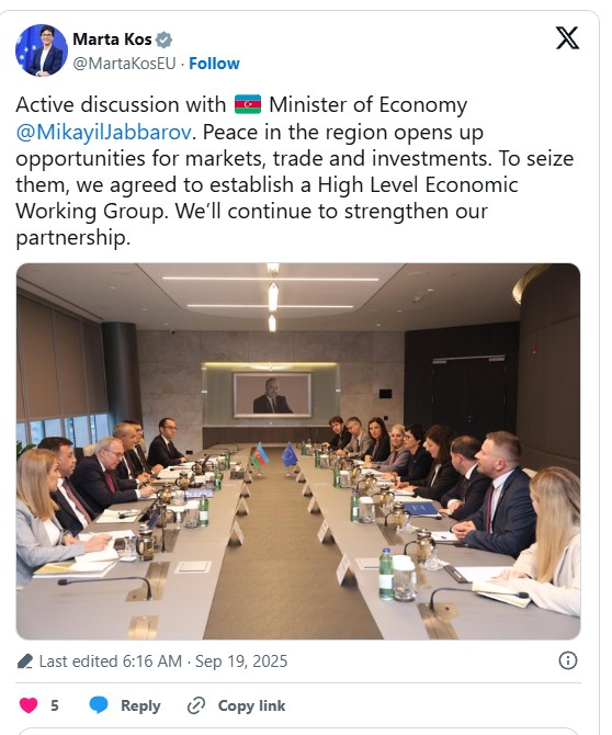 Bu barədə Aİ-nin genişlənmə məsələləri üzrə komissarı Marta Kos iqtisadiyyat naziri Mikayıl Cabbarovla görüşünün nəticələrinə dair "X" sosial şəbəkəsindəki hesabında paylaşım edib.