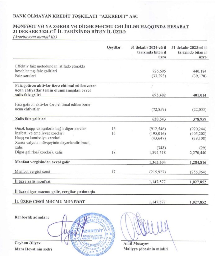 Marja.az xəbər verir ki, “Azkredit"in faiz gəlirləri 2023-cü ildə 440 min manat ikən, 2024-cü ildə 727 min manata yüksəlib. Həmçinin, ötən il təşkilat 1 milyon 894 min manat digər gəlirlər də əldə edib (2023-cü ildə 2 milyon ,270 min manat).