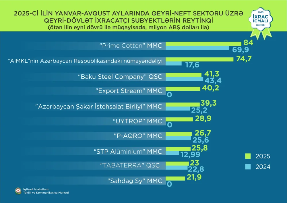 Marja.az İcmala istinadən xəbər verir ki, 2025-ci ilin yanvar-avqust ayları üzrə hazırlanmış qeyri-dövlət ixracatçı subyektlərin reytinqində ilk onluqda 1-ci yeri "Prime Cotton" MMC tutub.