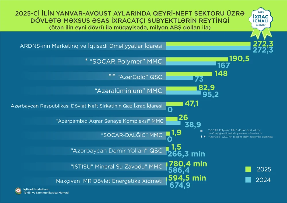 “İSTİSU” Mineral Su Zavodu” MMC qeyri-neft sektoru üzrə ixrac əməliyyatlarında iştirak edən dövlətə məxsus olan şirkətlərin siyahısında 9-cu yeri tutub.