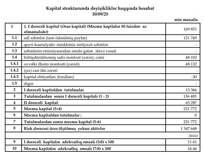 Bankın məcmu kapitalı ilin əvvəlindəki 185 milyon 14 min manatdan 221 milyon 772 min manata yüksəlib. Artım 36,8 milyon manat və ya 19,9% təşkil edib.