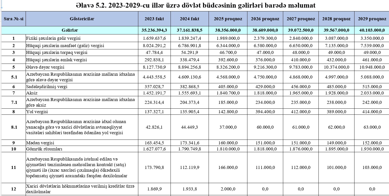 Azərbaycan büdcəsinin gəlirləri 2029-cu ilə qədər 40 milyard 103 milyard manata yüksələcək — artım vergi daxilolmalarının hesabına baş verirAzərbaycanın dövlət büdcəsinin gəlirləri 2023–2029-cu illər aralığında sabit artım göstərəcək.