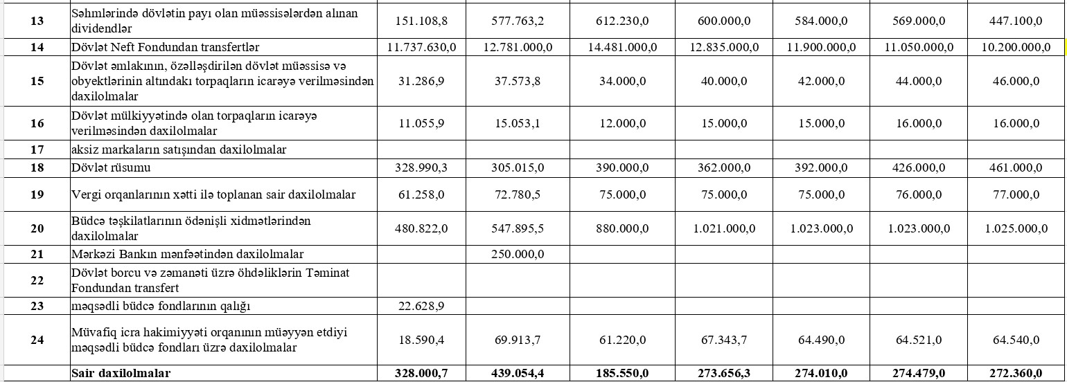 Marja.az rəsmi proqnozlara istinadən xəbər verir ki, 2023-cü ildə 35 milyard 236 milyon manat olan ümumi gəlirlər 2029-cu ilə qədər 40 milyard 103 milyon manata çatacaq — bu, təxminən 4 milyard 867 milyon manatlıq artım və təxminən 13.8% artım deməkdir.