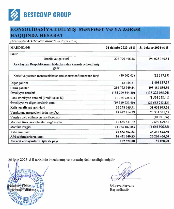 Kompüterərin, avadanlıqların və proqram təminatlarının topdan və pərakəndə satışı ilə məşğul olan "Bestcomp Group" QSC 2024-cü ili 26 milyon 347 min manat xalis mənfəət ilə başa vururb. Şirkət 2023-cü ili 26 milyon 553 min manat xalis mənfəət ilə bağlamışdı. Beləliklə, ötən il "Bestcomp Group"un xalis mənfəəti cüzi azalıb.