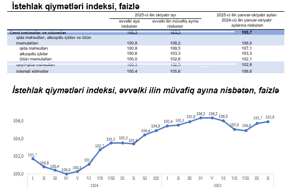 2025-ci ilin oktyabr ayında istehlak qiymətləri indeksi 2024-cü ilin oktyabr ayına nisbətən 5,9 faiz, o cümlədən qida məhsulları, alkoqollu içkilər və tütün məmulatları üzrə 8,2 faiz, qeyri-qida məhsulları üzrə 2,5 faiz, əhaliyə göstərilmiş ödənişli xidmətlər üzrə 5,6 faiz artıb
