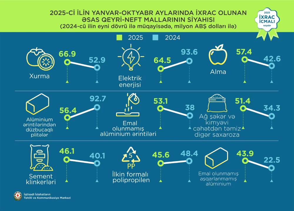 2025-ci ilin oktyabr ayı ərzində ixrac edilmiş qeyri-neft sektoruna aid malların siyahısında qızıl(38.9 milyon ABŞ dolları) birinci olub. Bu siyahıda xurma (32.7 milyon ABŞ dolları) ikinci, meşə fındığı (23,9 milyon ABŞ dolları) isə üçüncü yerdə qərarlaşıb.