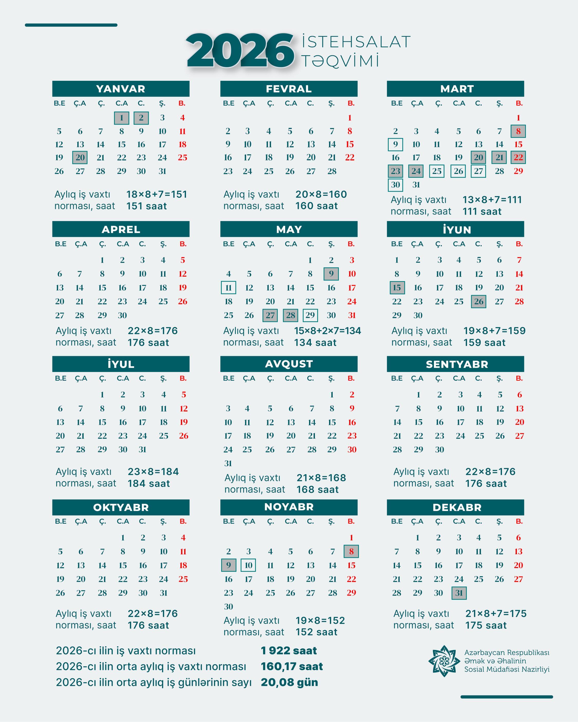 2026-cı il üçün iş vaxtı normasında qeyd edilir ki, Əmək Məcəlləsinə və Nazirlər Kabinetinin “2026-cı il üçün Novruz, Ramazan və Qurban bayramları günlərinin müəyyən edilməsi haqqında” 2025-ci il 2 dekabr tarixli 362 nömrəli Qərarına əsasən 2026-cı ildə aşağıdakı günlər iş günü hesab edilmir: