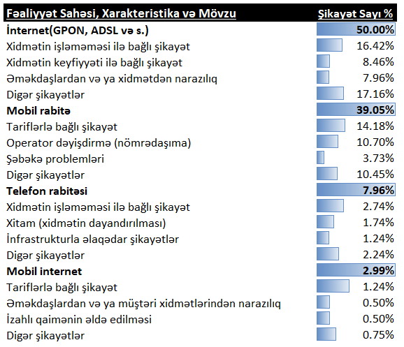 Telefon rabitəsi xidməti üzrə daxil olan müraciətlər xidmətin işləməməsi (2,74%), xidmətin dayandırılması (1,74%) və infrastruktur ilə bağlı (1,24%) əsas kateqoriyalara ayrılıb.