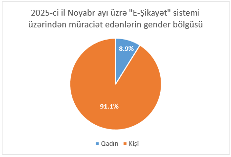 Sistem üzərindən noyabr ayı üzrə 91,1% kişi, 8,9% qadın müraciət edib.