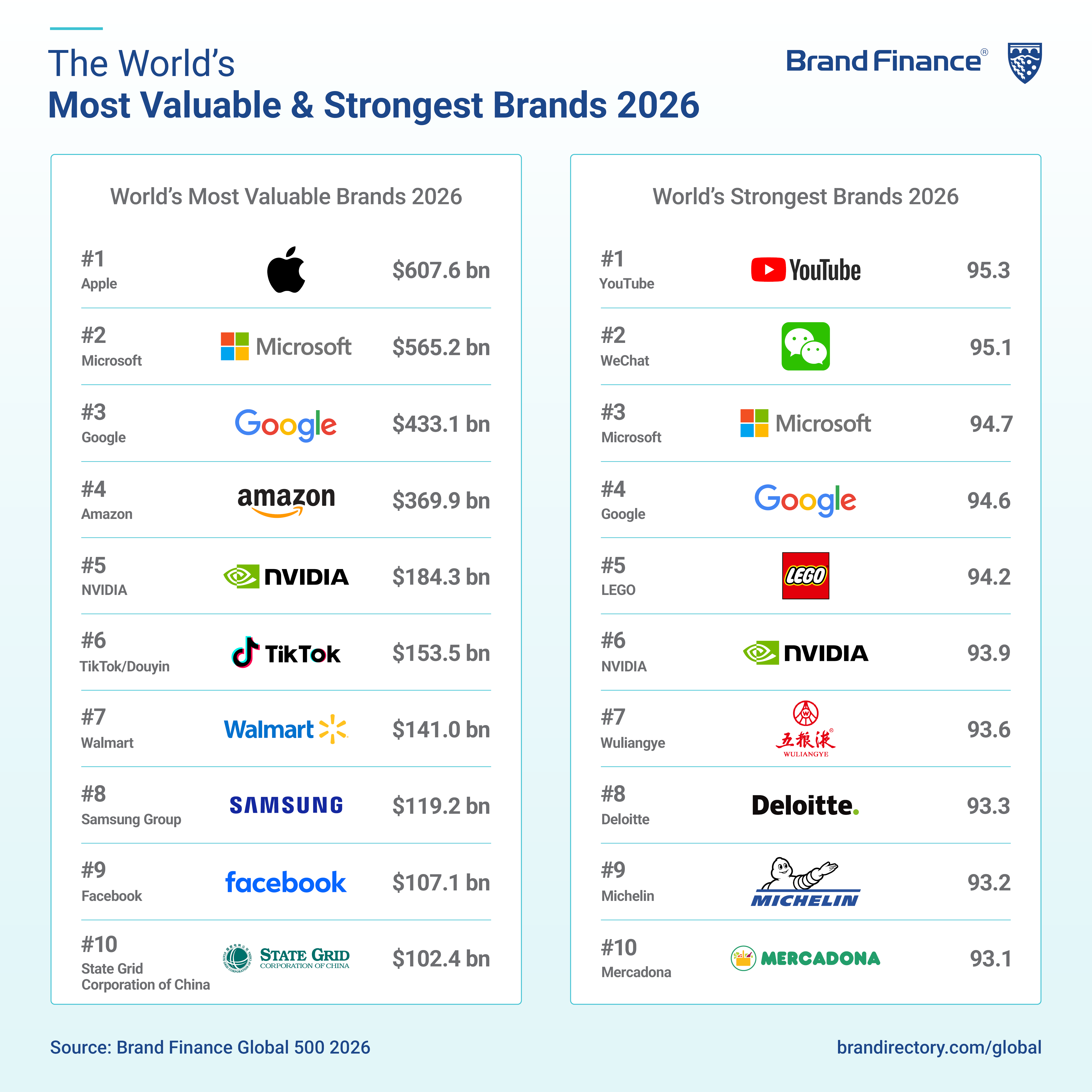 Brand Finance-in “Global 500 2026” araşdırmasına əsasən, Apple dünyanın ən dəyərli markası mövqeyini qoruyaraq 6% artımla 607,6 milyard dollar marka dəyərinə çatıb. Cihaz satışlarında artım məhdud qalsa da, reklam, bulud xidmətləri və App Store daxil olmaqla xidmətlər sahəsi şirkətin 2025-ci ilin dördüncü rüb üzrə maliyyə nəticələrinə əsasən performansı gücləndirməyə davam edib. Bu artım Amerika qitəsi, Avropa və Asiya-Sakit okean regionlarında sabit tələblə dəstəklənib.