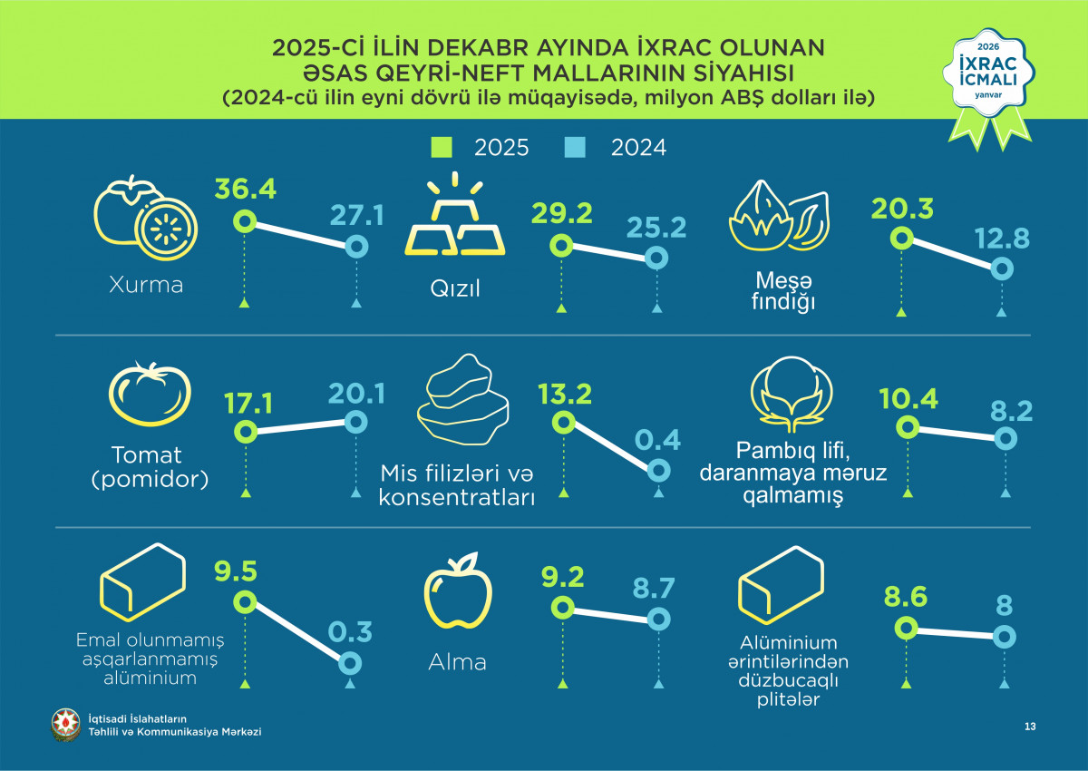 2025-ci ilin dekabr ayı ərzində ixrac edilmiş qeyri-neft sektoruna aid malların siyahısında xurma (36,4 milyon ABŞ dolları) birinci olub. Bu siyahıda qızıl (29,2 milyon ABŞ dolları) ikinci, qabığı təmizlənmiş meşə fındığı ( 20,3 milyon ABŞ dolları) isə üçüncü yerdə qərarlaşıb.