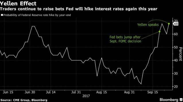 "Marja" Bloomberg-ə istinadən xəbər verir ki, Fed-in faiz artıracağl ehtimalı 68 faiz ətrafına yüksəlib. Fed-in bu il daha bir dəfə faiz artıracağına 8 Sentyabrda 22%-lik bir ehtimal verilirdi. Fedin Dekabr ayında fazləri artıracağı gözlənilir.