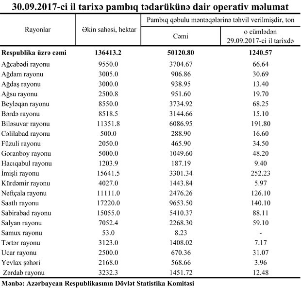 Sentyabrın 30-dək pambıq qəbulu məntəqələrinə ölkə üzrə 50 min 120,80 ton məhsul təhvil verilib.