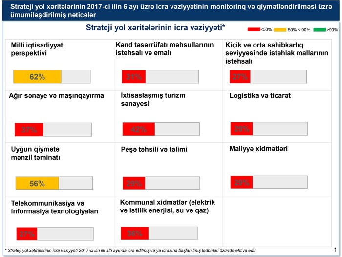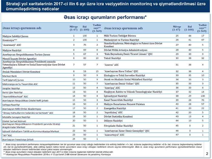Maliyyə Sabitliyi Şurası və “Azərbaycan Respublikasında biznes mühitinin əlverişliliyinin artırılması və beynəlxalq reytinqlərdə ölkəmizin mövqeyinin daha da yaxşılaşdırılması ilə bağlı əlavə tədbirlər haqqında” Azərbaycan Respublikası Prezidentinin 2016-cı il 13 iyul tarixli Sərəncamı ilə yaradılan Komissiya üzərinə düşən işləri 100 faiz icra etmişdir. “Azərenerji” ASC 75 faiz, Maliyyə Nazirliyi 69 faiz, Turizm Şurası 67 faiz, Mənzil İnşaatı Dövlət Agentliyi 60 faiz, Vətəndaşlara Xidmət və Sosial İnnovasiyalar üzrə Dövlət Agentliyi 57 faiz, Əmlak Məsələləri Dövlət Komitəsi 53 faiz icra göstəricisinə malikdir. 16 qurum 2017-ci ilin birinci yarısı üzrə strateji yol xəritələrində nəzərdə tutulan tədbirlərin 50 faizini, 20 qurum 50 faizdən azını və nəhayət 3 qurum isə (Fövqəladə Hallar Nazirliyi, Azərbaycan Xəzər Dəniz Gəmiçiliyi QSC, Azəravtoyol ASC)heç bir tədbiri icra etməyib.