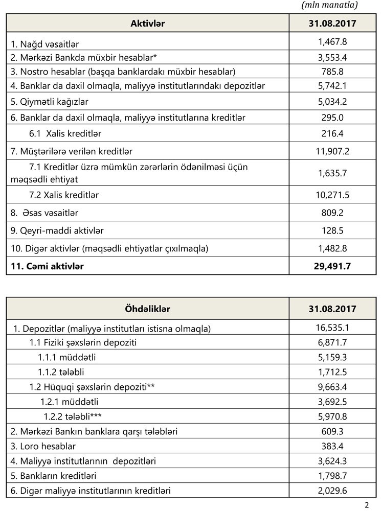 Azərbaycanda fəaliyyət göstərən 31 bankın 31 avqust 2017-ci il tarixinə cəmi aktivləri 29 milyard 491.7 milyon manat, cəmi öhdəlikləri isə 26 milyard 568.2 milyon manat təşkil etmişdir.