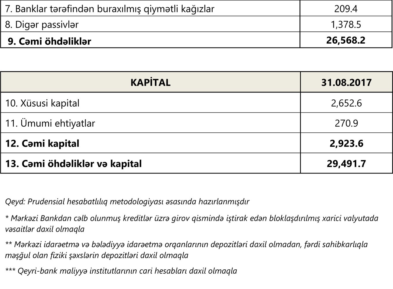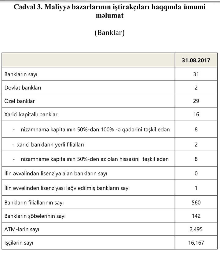 2017-ci ilin 31 avqust tarixinə olan bank sektorunun əsas göstəriciləri bank sektorunun icmal göstəricilərində öz əksini tapmışdır.