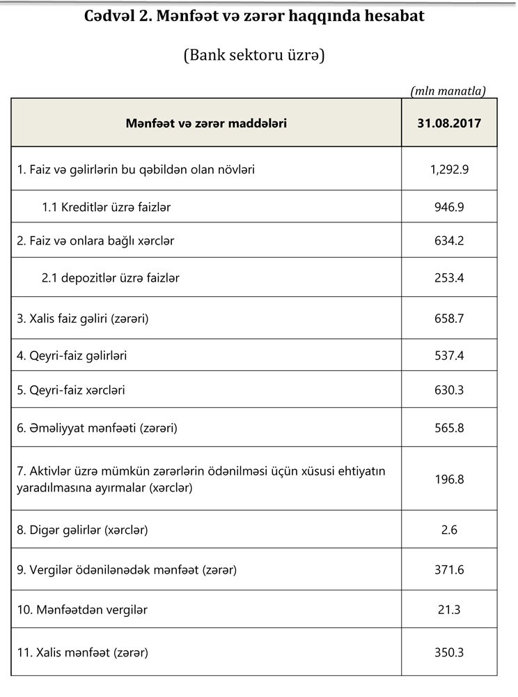 2017-ci ilin 8 ayı ərzində bank sektorunun cəmi xalis mənfəəti 350,3 milyon manat təşkil edib.