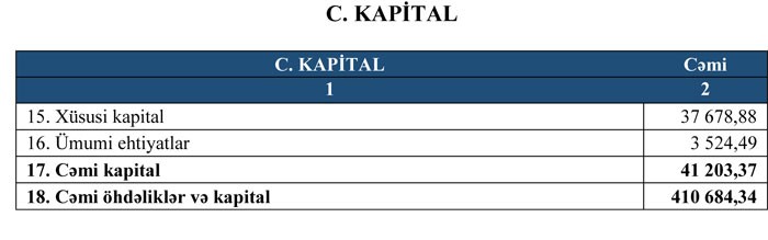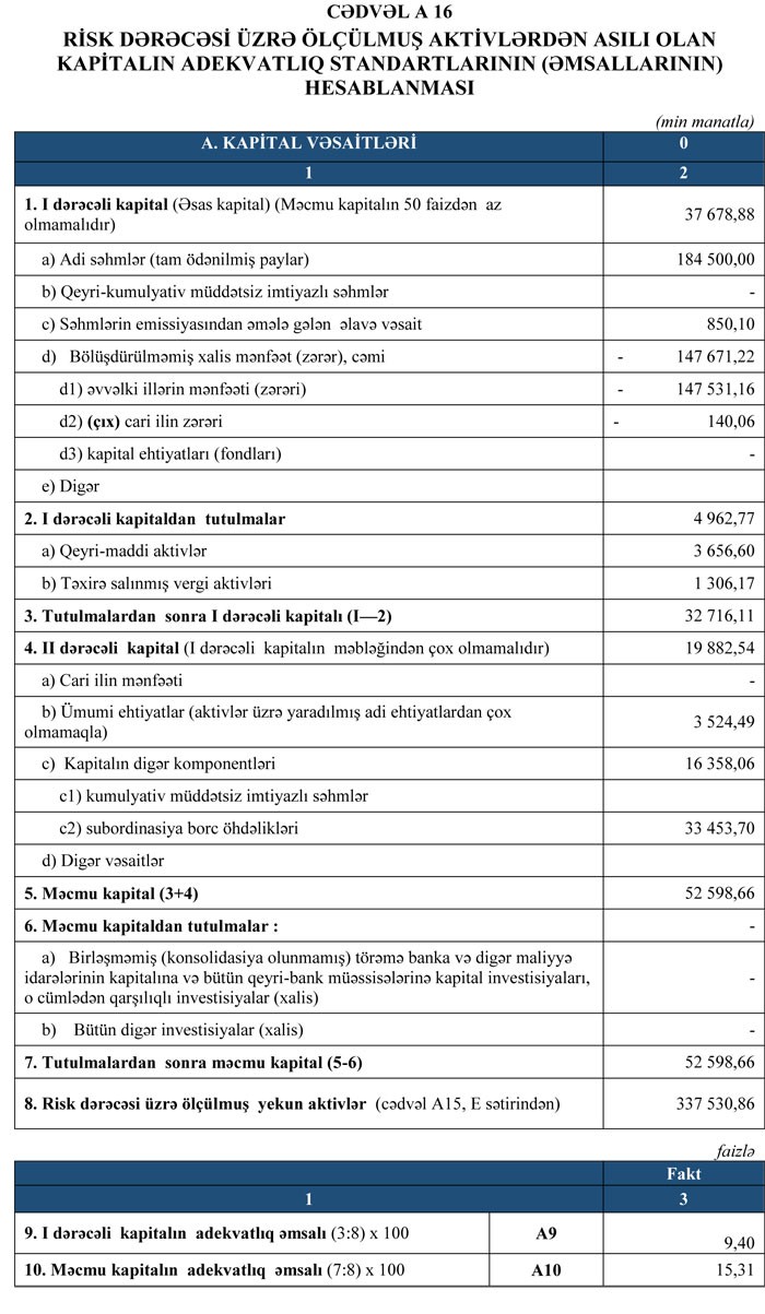 Bank 2016-cı ilin sonunda 439 milyon 726 min manat cəmi aktivlərə, 399 milyon 165 min manat cəmi öhdəliklərə və 40 milyon 561 min manat cəmi kapitala malik olub.