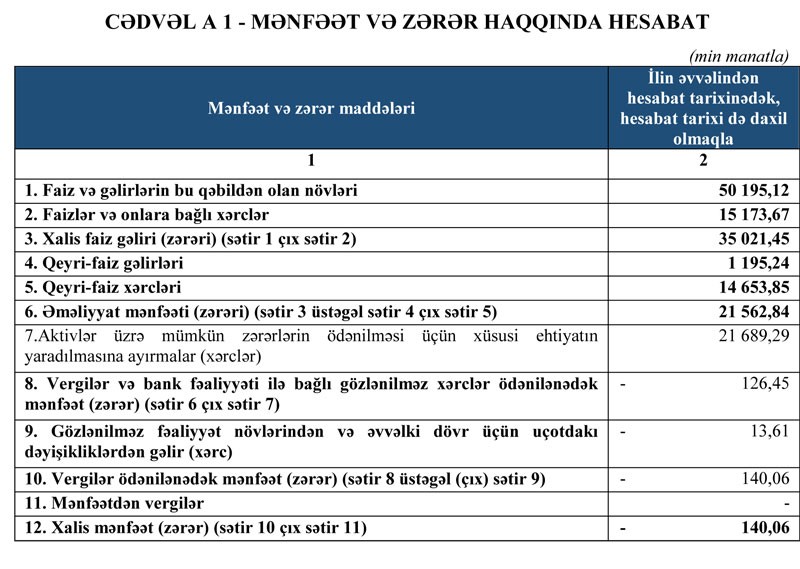 “Marja” xəbər verir ki, cari ilin yanvar-sentyabr dövründə Bankın cəmi gəlirləri 51 milyon 390 min manat, cəmi xərcləri isə 29 milyon 826 min manat təşkil edib. Nəticədə, 21 milyon 562 min manat əməliyyat mənfəəti yaranıb. Bu ilin 9 ayı üzrə aktivlər üzrə mümkün zərərlərin ödənilməsi üçün xüsusi ehtiyatın yaradılmasına 21 milyon 689 min manat ayırıldığından, bank 140 min manat zərər edib.