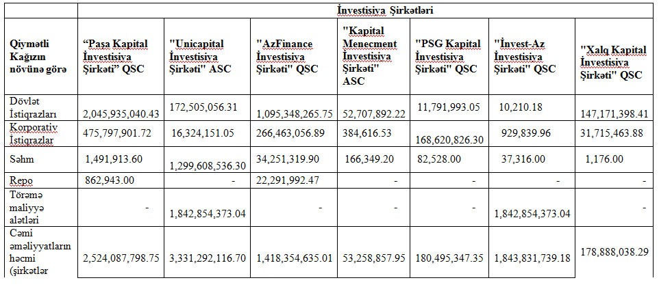 İkinci yerdə 2,5 milyard manat dövriyyə ilə “Paşa Kapital İnvestisiya Şirkəti” QSC, üçüncü yerdə isə 1,4 milyard manat dövriyyə ilə "AzFinance İnvestisiya Şirkəti" QSC-dir.