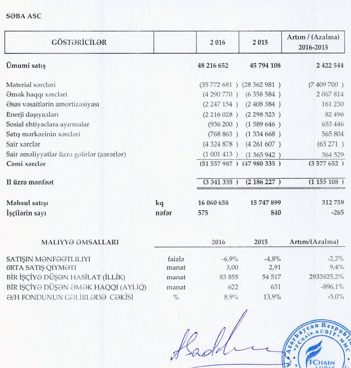 "Marja" şirkətin maliyyə hesabatlarına istinadən xəbər verir ki, 2016-cı ildə ASC-nin satışları 48 milyon 216 min manat təşkil edib. Bu, 2015-ci illə müqayisədə 2 milyon 422 min manat və ya 5,3% çoxdur. "Səba" ASC 2015-ci ildə 45 milyon 794 min manat satış reallaşdırmışdı.