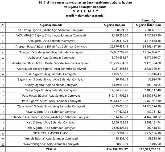 2017-ci ilin yanvar-sentyabr ayları ərzində Azərbaycanda fəaliyyət göstərən 22 sığorta (AzRe təkrarsığorta şirkəti nəzərə alınmadan) şirkəti tərəfindən 414 milyon 353 min manat sığorta haqqı toplanıb.