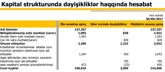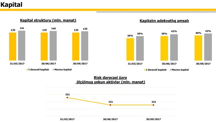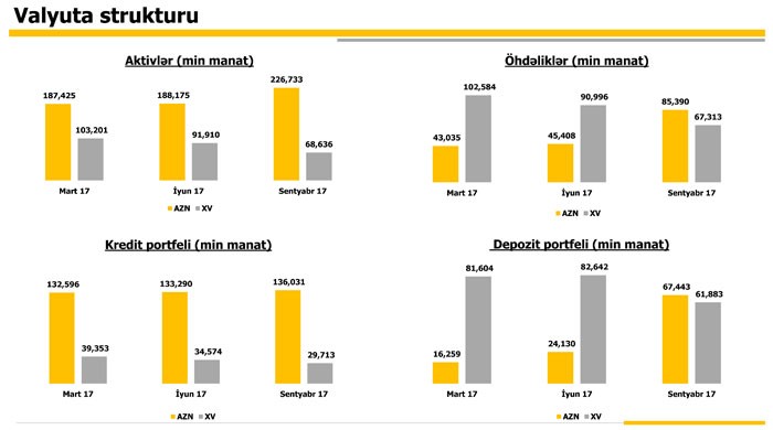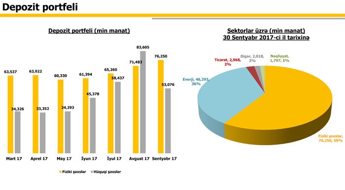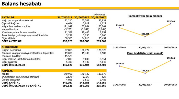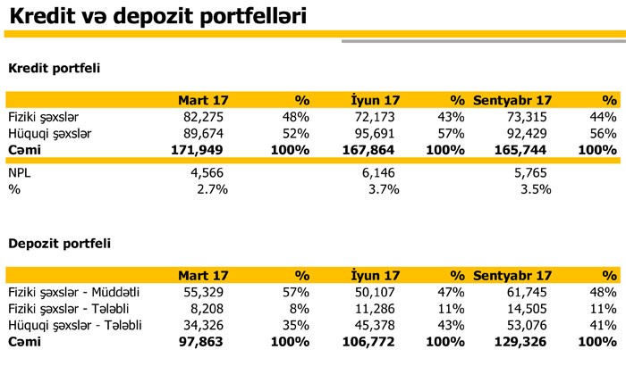 Ötən ilin sonu ilə müqayisədə müştərilərə verilən kreditlər 214 milyon 595 min manatdan 165 milyon 744 min manata düşüb, müştərilərin depozitləri isə 79 milyon 505 min manatdan 129 milyon 326 min manata qalxıb.