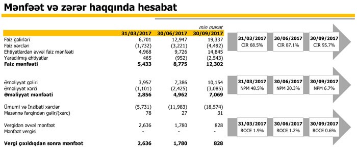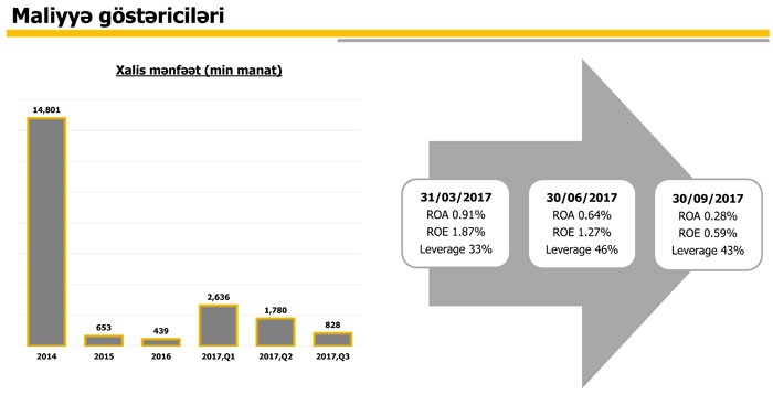 Eyni dövrdə Bankın cəmi xərcləri 28 milyon 694 min manat təşkil etmiş və nəticədə Bank 828 min manat xalis mənfəət əldə edib. Bank 2016-cı ili 439 min manat xalis mənfəətlə bağlamışdı.