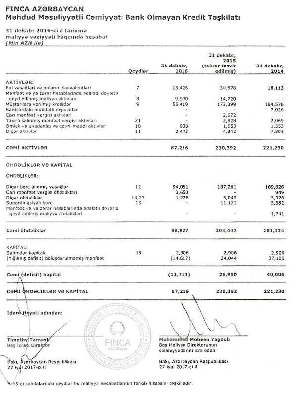 31 Dekabr 2016-ci il tarixində “FINCA Azerbaijan”ın 87 milyon 216 min manat cəmi aktivləri olduğu halda öhdəlikləri 98 milyon 927 min manat təşkil edib. Bu, iqtisadi mənada iflas deməkdir. Sadə şəkildə qeyd etsək, kredit təşkilatının borcu alacağından çoxdur.