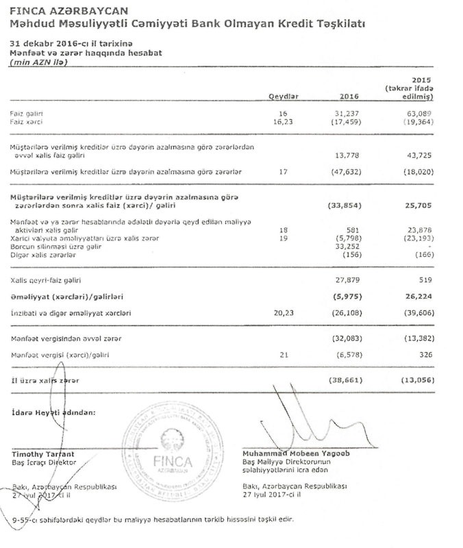 “FINCA Azerbaijan” müştərilərə verdiyi kreditlərə görə böyük zərərə düşüb. Gecikmədə olan kreditlərə görə, təkcə keçən il, 47 milyon 632 min manat ehtiyatlara ayrma nəzərdə tutulub. Lakin təşkilatın 13 milyon 778 min manat xalis faiz mənfəəti ehtiyata ayırmanı təmin edə bilməyib. Nəticədə təşkilatın 33 milyon 854 min manat faiz zərəri yaranıb. Əməliyyat, inzibati və digər xərclərdə üstə gəlindikdə zərər 38 milyon manatı keçib və şirkətin kapitalını silib.