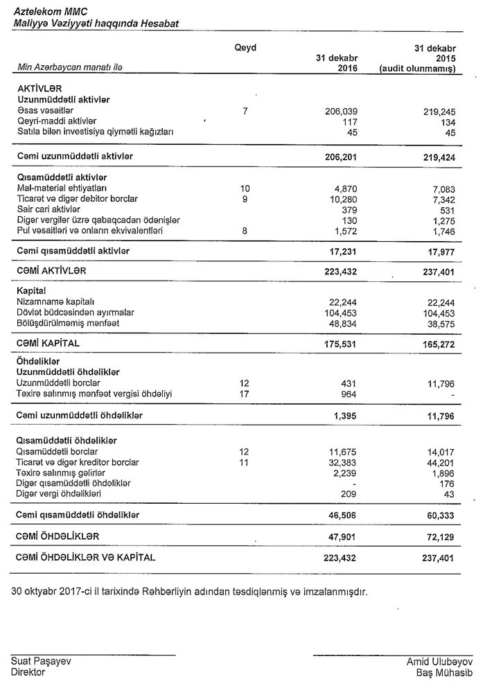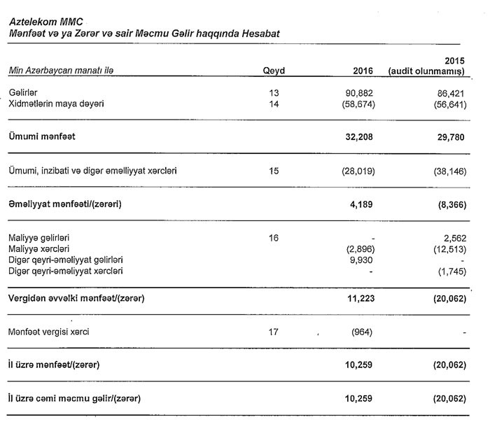 "Aztelekom" MMC 2016-cı ildə 10 milyon 259 min manat xalis mənfəət əldə edib.