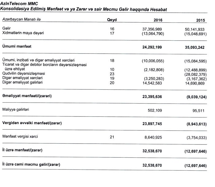 "Marja" MMC-nin maliyyə hesabatlarına istinadən xəbər verir ki, 2015-ci illə müqayisədə “AzInTelecom”un cəmi gəlirləri təxminən 25% azalaraq 50,1 milyon manatdan 37,4 milyon manata düşüb.