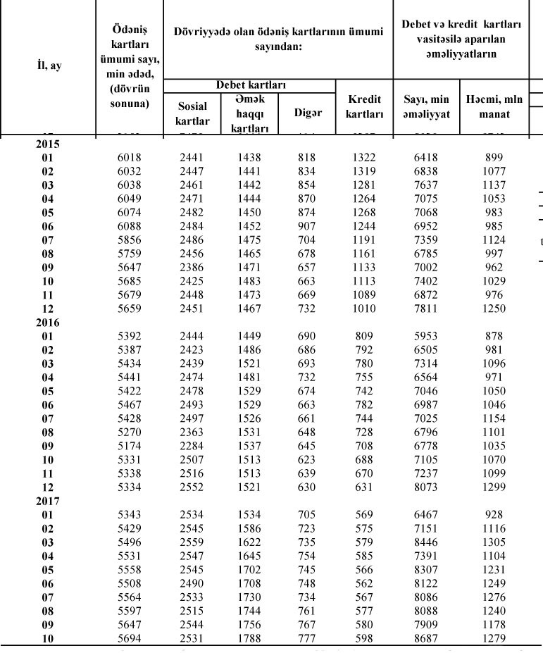 Cəmi ödəniş kartlarının 2 milyon 531 min ədədini sosial kartlar, 1 milyon 788 min ədədini əməkhaqqı kartları, 598 min ədədini kedit kartları və 777 min manatını digər debet kartlar təşkil edib.
