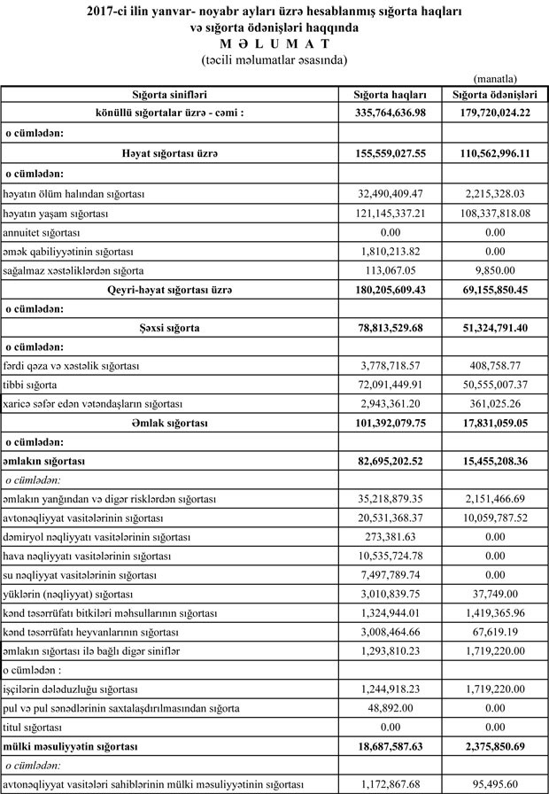 2017-ci ilin yanvar-noyabr ayları ərzində Azərbaycanda fəaliyyət göstərən 21 sığorta şirkəti tərəfindən 504,234,798 milyon manat sığorta haqqı toplanmışdır. Bu, 2016-cı ilin 11 ayı ilə müqayisədə 12,4% çoxdur. Bu barədə "Marja"ya Maliyyə Bazarlarına Nəzarət Palatasından bildirilib.